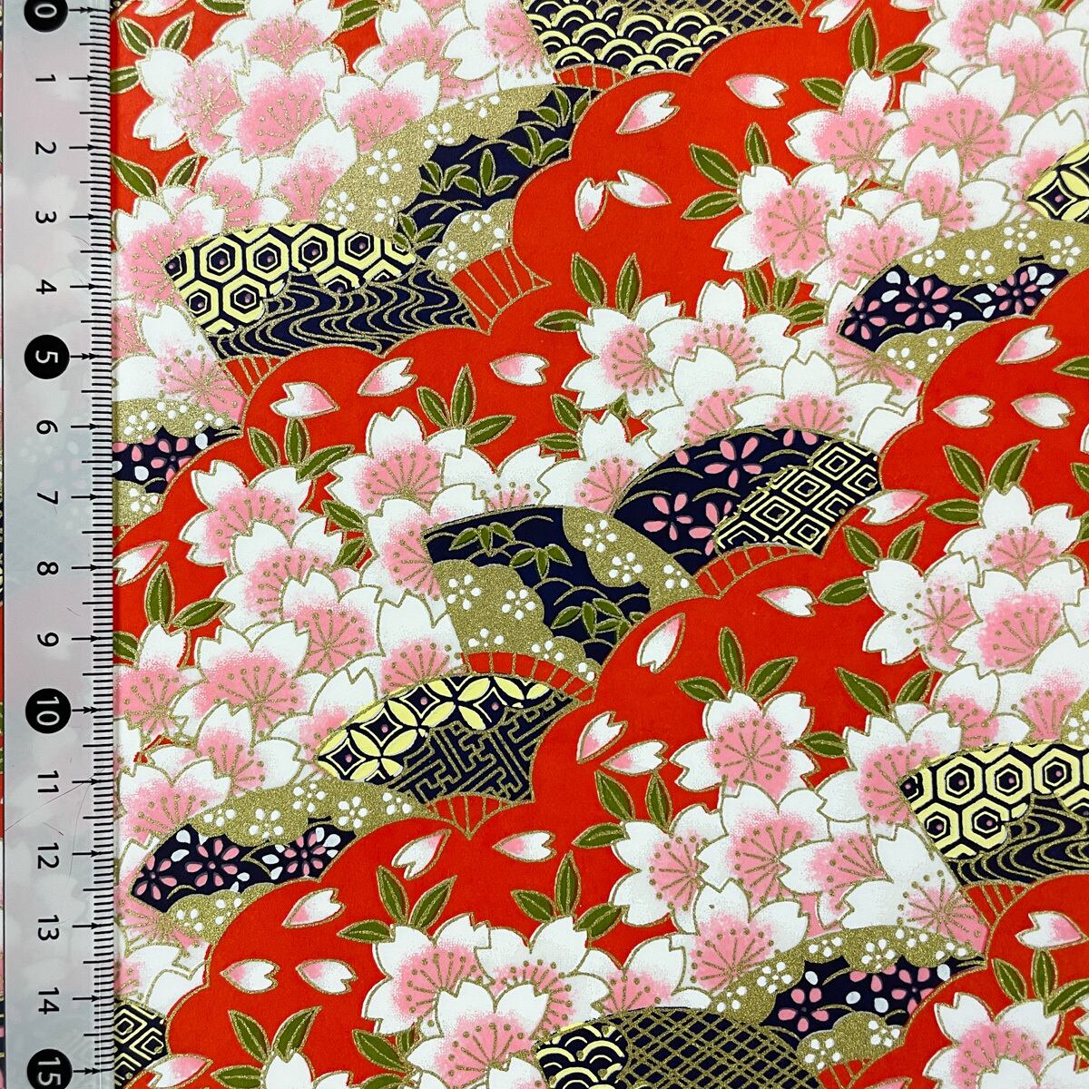 華やかな友禅和紙 桜と金扇 赤地 菊判 大判 約63x93cm 千代紙 YUZEN dyeing