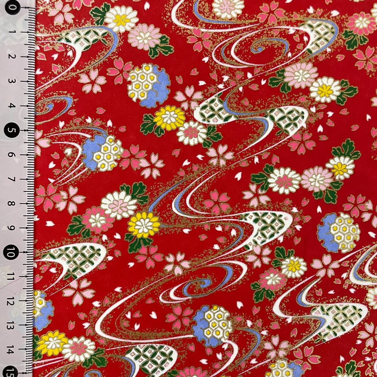 華やかな友禅和紙 風にそよぐ桜と菊 雪輪紋様 赤 大判 約63x93cm 千代紙 Yuzen Dyeing