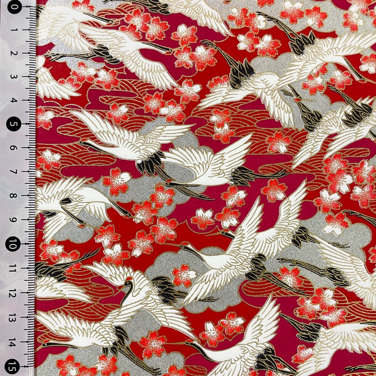 友禅和紙 華やか 羽ばたく鶴と桜 紅赤地 大判 約63x93cm 千代紙 Yuzen Dyeing
