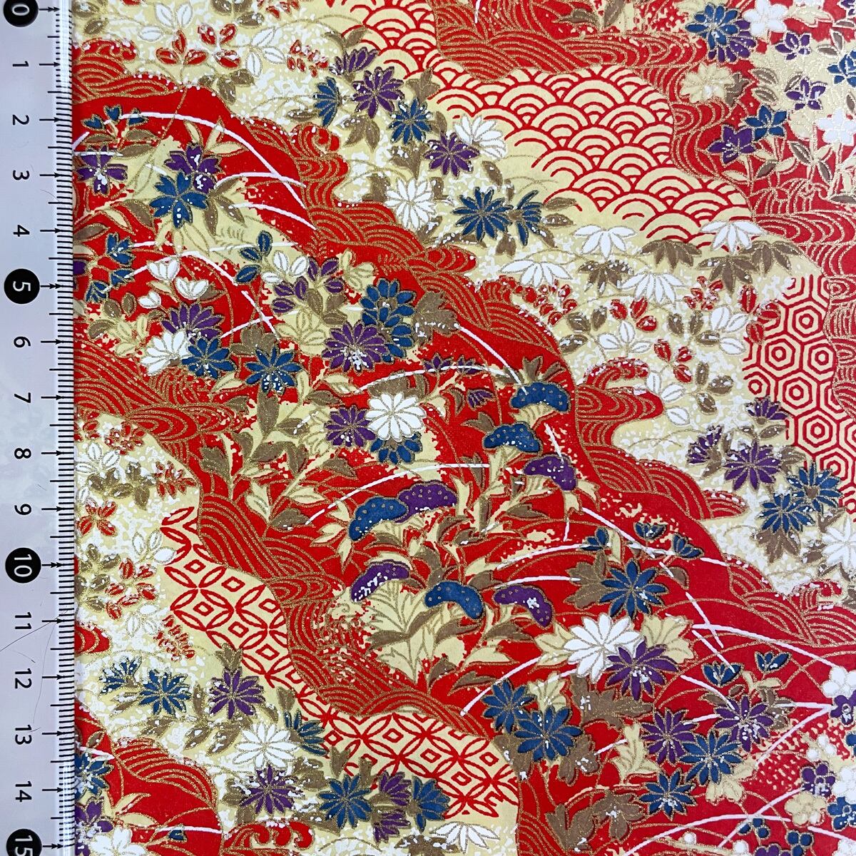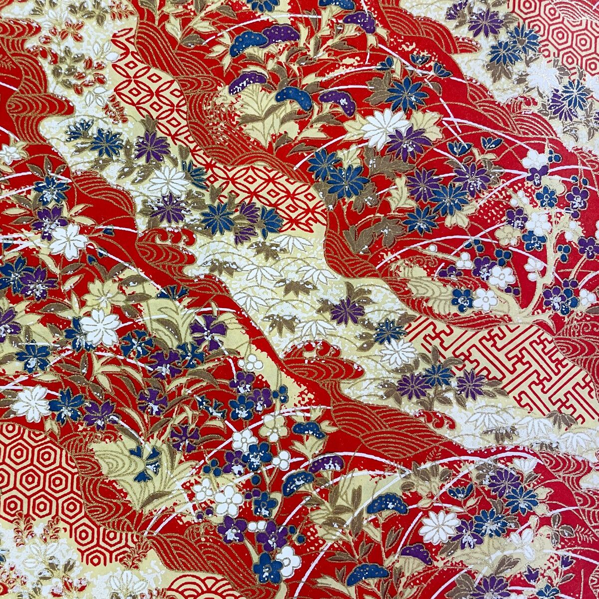 友禅和紙 華やか古典柄 切り継ぎ風 秋の草花 赤 青 大判 約63x93 cm 千代紙