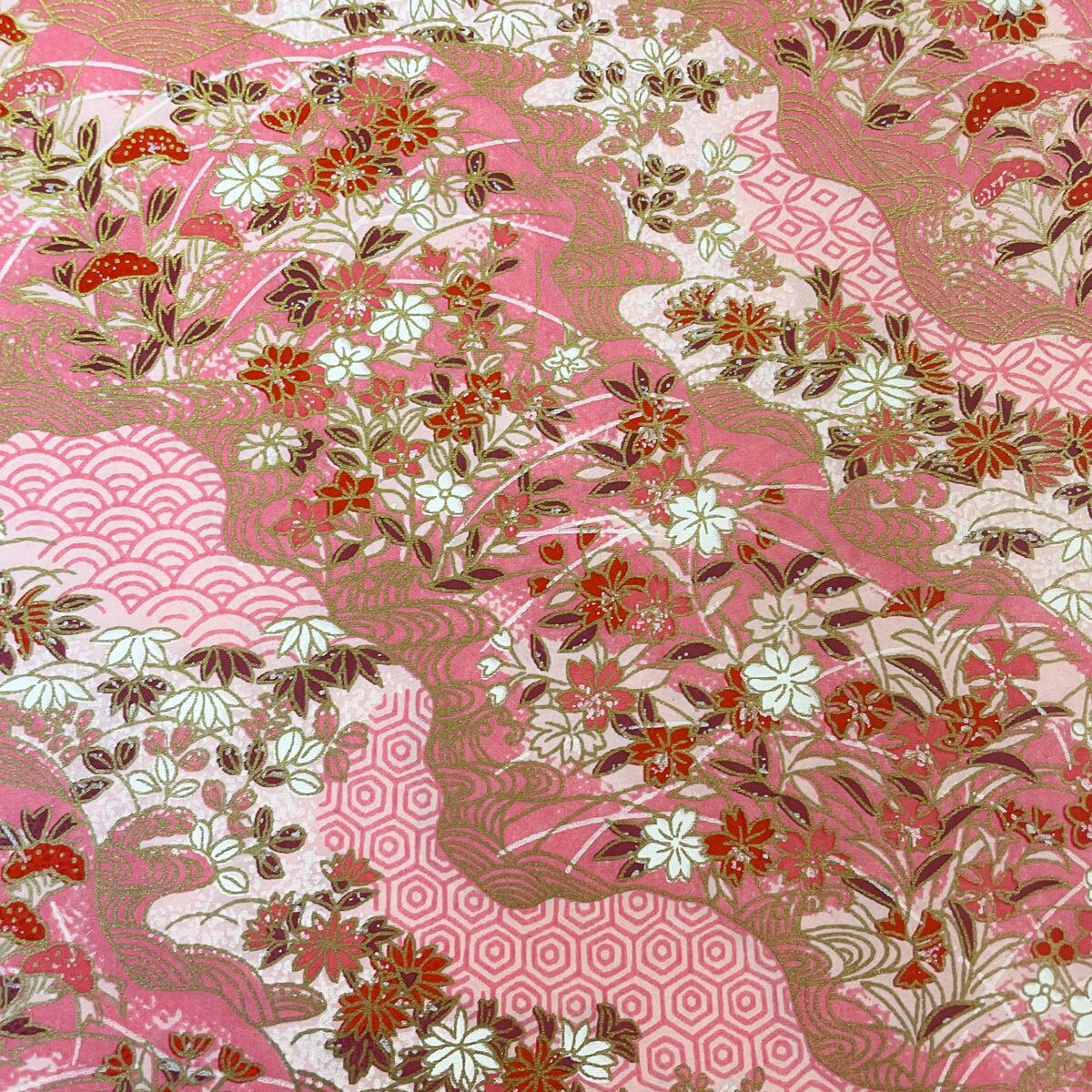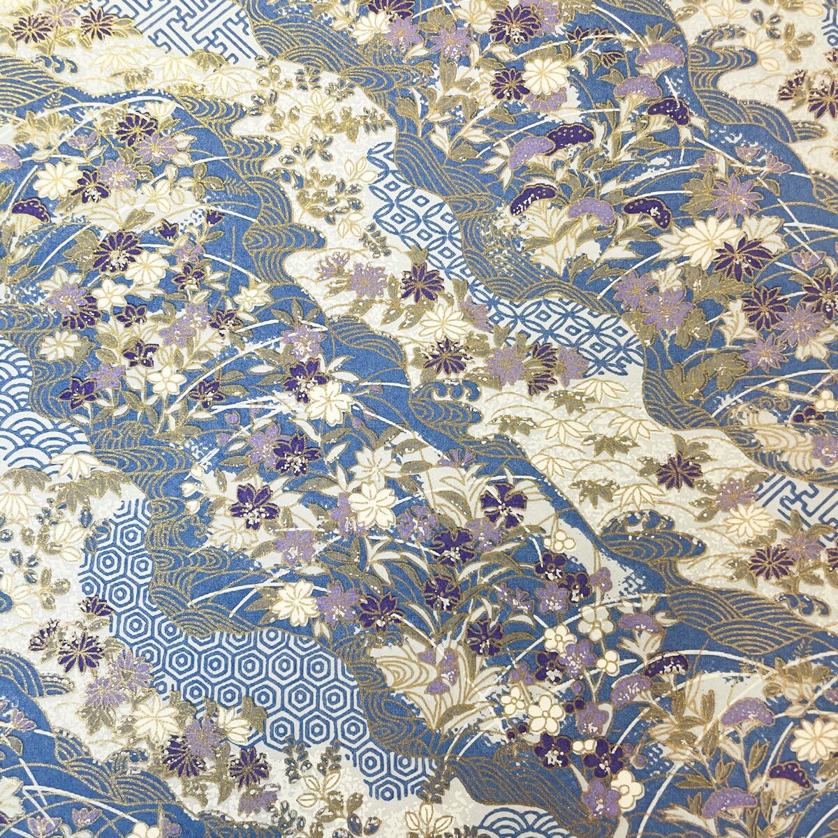 友禅和紙 華やか古典柄 切り継ぎ風 秋の草花 ピンク ブルー 桃色 水色 大判 約63x93cm 千代紙 Yuzen Dyeing