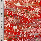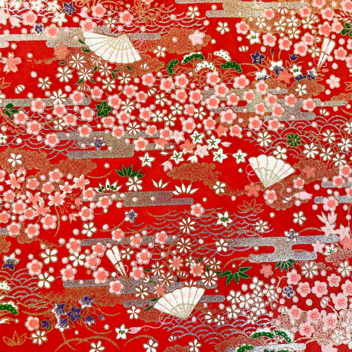 華やかな友禅紙 小さな扇と梅の花 小花 松竹梅 赤地 大判 約63x93cm 千代紙 Yuzen Dyeing 97588195
