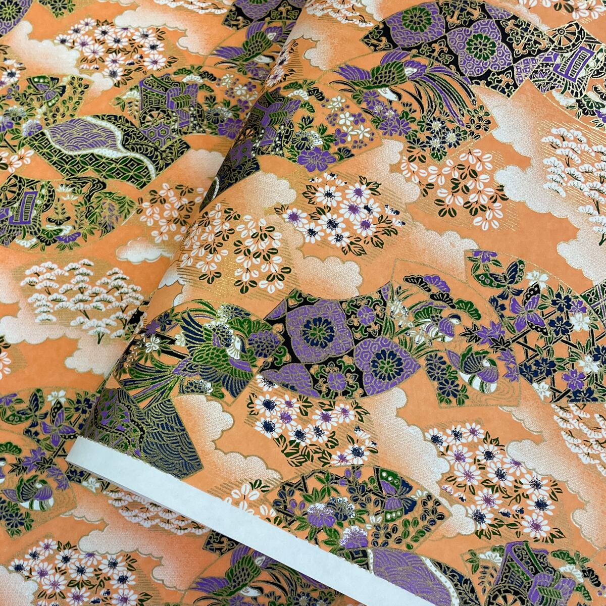 華やかな友禅紙 扇と秋の草花 萩 菊 藤袴 オレンジ色 肌色 大判 約63x93cm 千代紙 Yuzen dyeing
